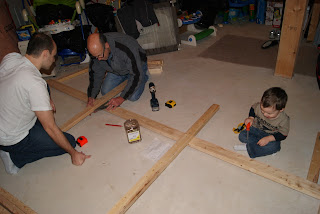 Dan's dad came over on Saturday to help Dan build some shelves in the basement. I was thrilled as I was getting sick of looking at the piles on the floor down there. Over the last few weeks we have been selling stuff on Kijiji that we don't need/want any more but it wasn't doing enough to help us get organized. Plus, we have a large number of Rubbermaid bins that are great for storage, but kind of annoying to have stacked on top of each other. Not only do they not hold the weight of each other that great but it's really a pain to get something from the bottom bin. So, papa to the rescue!!